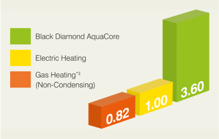 Compared to typical gas and direct electric heating systems that can have higher running costs with inefficient COPs as low as 0.82*1, the Black Diamond AquaCore Hot Water Heat Pump provides a real energy efficient alternative.
