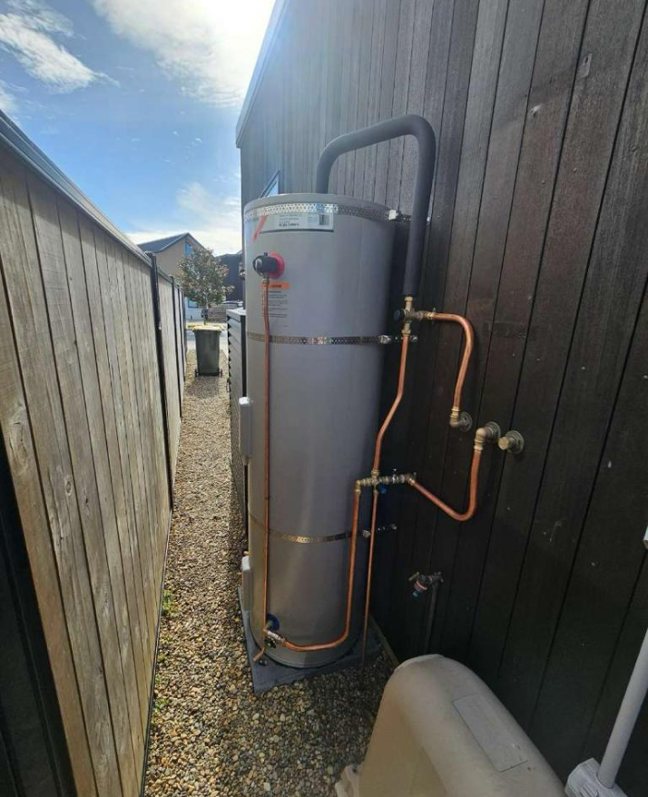 The home was built in 2022 with instant gas water heating and, therefore, had not been designed with an internal space for a hot water cylinder. Reluctant to delegate garage or laundry space for a cylinder and module, outdoor installation without penetrating the cedar cladding and weatherproof membrane of the house were key requirements.